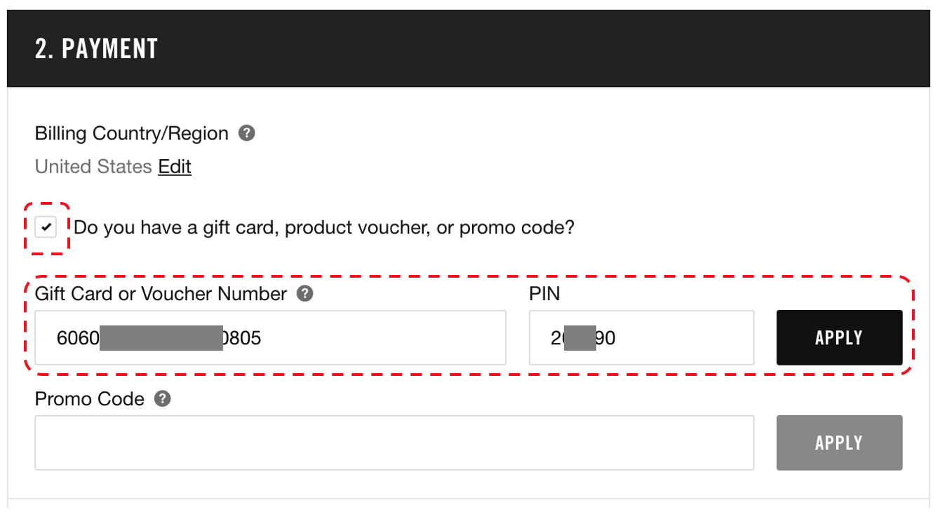 Para uso no site, você deve escolher a opção "Do you have a gift card, product voucher, or promo code?" já na página de checkout/pagamento e então inserir o código do gift card (19 dígitos), o código PIN (6 dígitos) que você encontrou no link que recebeu no seu email. Atenção: o campo para inserir o PIN será exibido apenas após inserido o código do gift card. Em seguida aperte o botão "Apply" para validar o gift card.