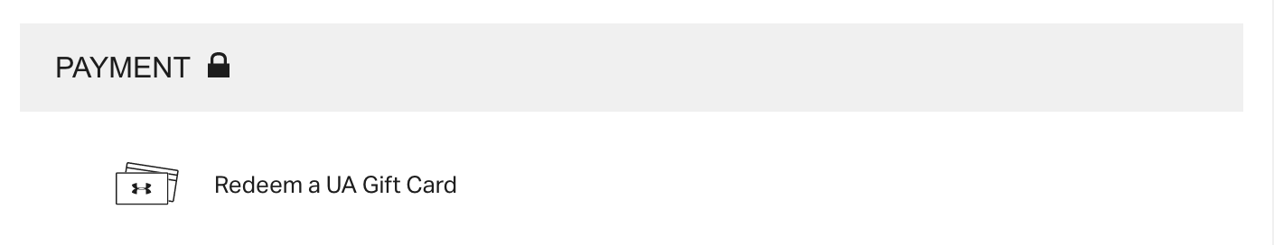Para uso no site, você deve escolher a opção "Redeem a UA Gift Card" já na página de checkout/pagamento e então inserir o código do gift card (16 dígitos) e o código PIN (8 dígitos) que você encontrou no link que recebeu no seu email. Em seguida aperte o botão "Apply" para validação.