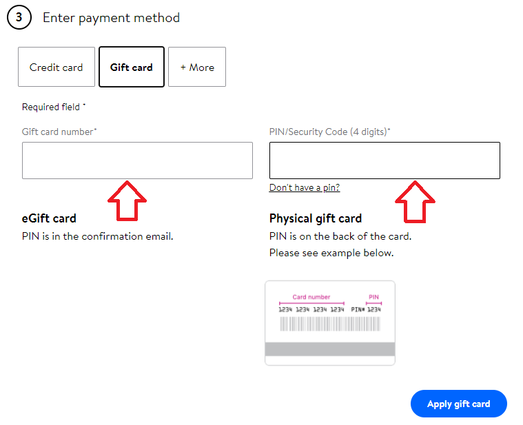 1. Após escolher o seu produto e ir para "Checkout", vá para "Enter Payment Method" e selecione o opção Gift card.